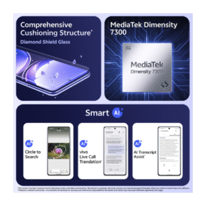 V50e is loaded with Smart AI features that enhance your productivity- AI Transcript Assist, AI Note Assist, Circle-to-Search, AI Screen Translation, Vivo Live Call Translation & Gemini